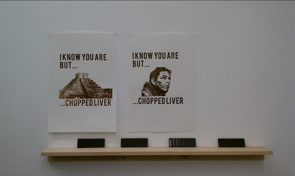 At 6:05 pm myself, Jen Rodewald, two NYU film students with hidden cameras(Alexander Schaefer and Emerson Rosenthal), three teen performers from queens armed with boxes of chocolate bars (Malik Ray, Demeterie Theodore and Sheldon Theodore) and about 100 New Yorkers got on the L train at 8th ave and road it to the Morgan stop in Bushwick. Those lucky straphangers got to experience a performance where the teens went from car to car seemingly hawking chocolate bars to passengers. Only these teens were not selling candy for basketball uniforms or made-up charities, in fact the chocolate was not available to anyone on the train. The performance continued at interstate gallery in Bushwick where the teens did their spiel but this time no one left the gallery without a chocolate bar in hand. Joshua Altman the creater of the artisanal chocolate company "What Am I? Chocolates" helped with the bars and custom silk screen prints done with dark chocolate. Below is a still of the installation in the gallery and a still from the subway and some video footage from the performance in the gallery.